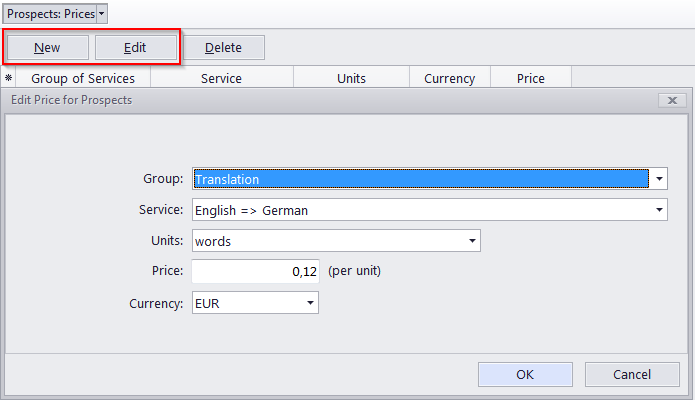 To add or edit a price, click the New/Edit button on the Prices tab of the Prospect window to create/edit an individual price, or in the Prospect Prices window to create/edit a general price.
