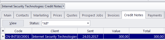 The Credit Notes tab of the Prospect window displays Credit notes for the currently selected former or inactive client.