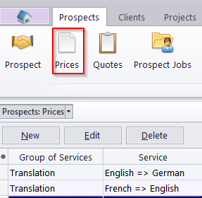 The Prospect Prices window displays your general price-list. These prices can be used when creating quotes for any prospect in your database.