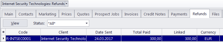 Use the Status filter drop-down list to display only the Refunds which are still to be linked with a credit note, or only the fully linked ones.