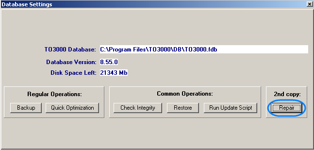 TO3000 is very reliable software running on very reliable database platform. However, nothing is perfect – and in cases when you are informed about errors after running Check Integrity command, it is necessary to attempt repairing database by running Repair command from Database Settings window.