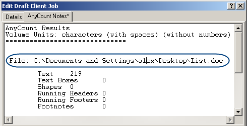 When Skip Numbers check box is selected, AnyCount produces count omitting numbers in the documents. If Show Full Path is selected, then in AnyCount Notes (which appear after you use AnyCount when creating Client/Expert Job ) you will see the full path of the file counted. For example, Show Full Path is selected: